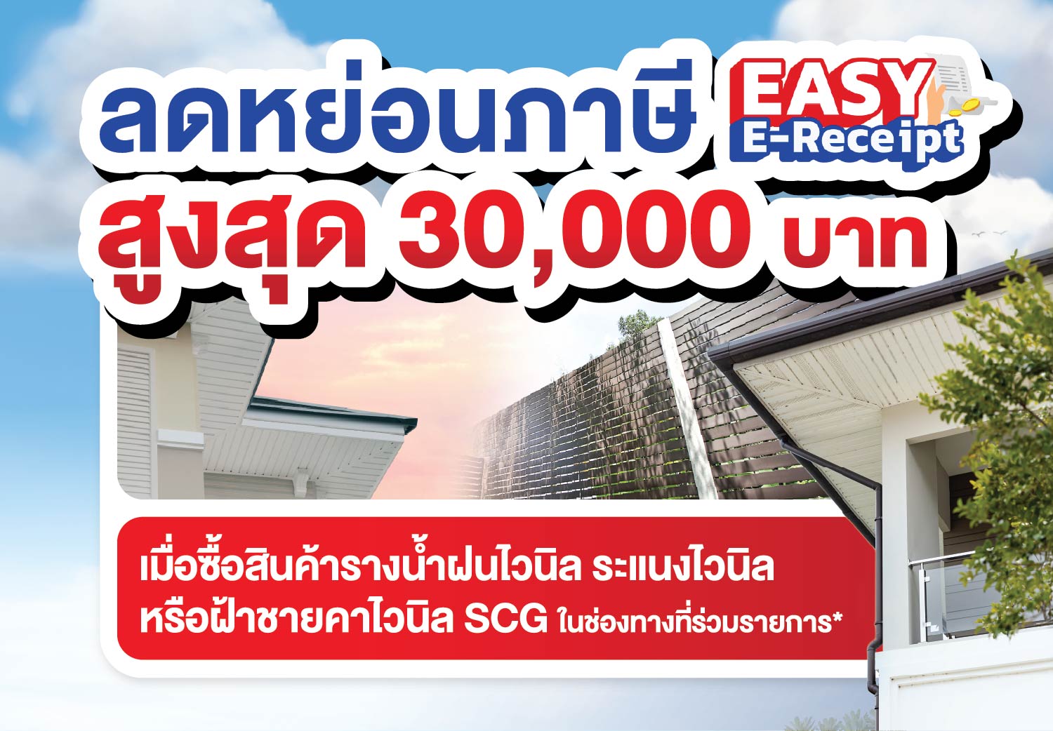 ชวนมาซื้อสินค้ารางน้ำฝนไวนิล ระแนงไวนิล หรือฝ้าชายคาไวนิล SCG รับสิทธิ์ลดหย่อนภาษีสูงสุด 30,000 บาท*