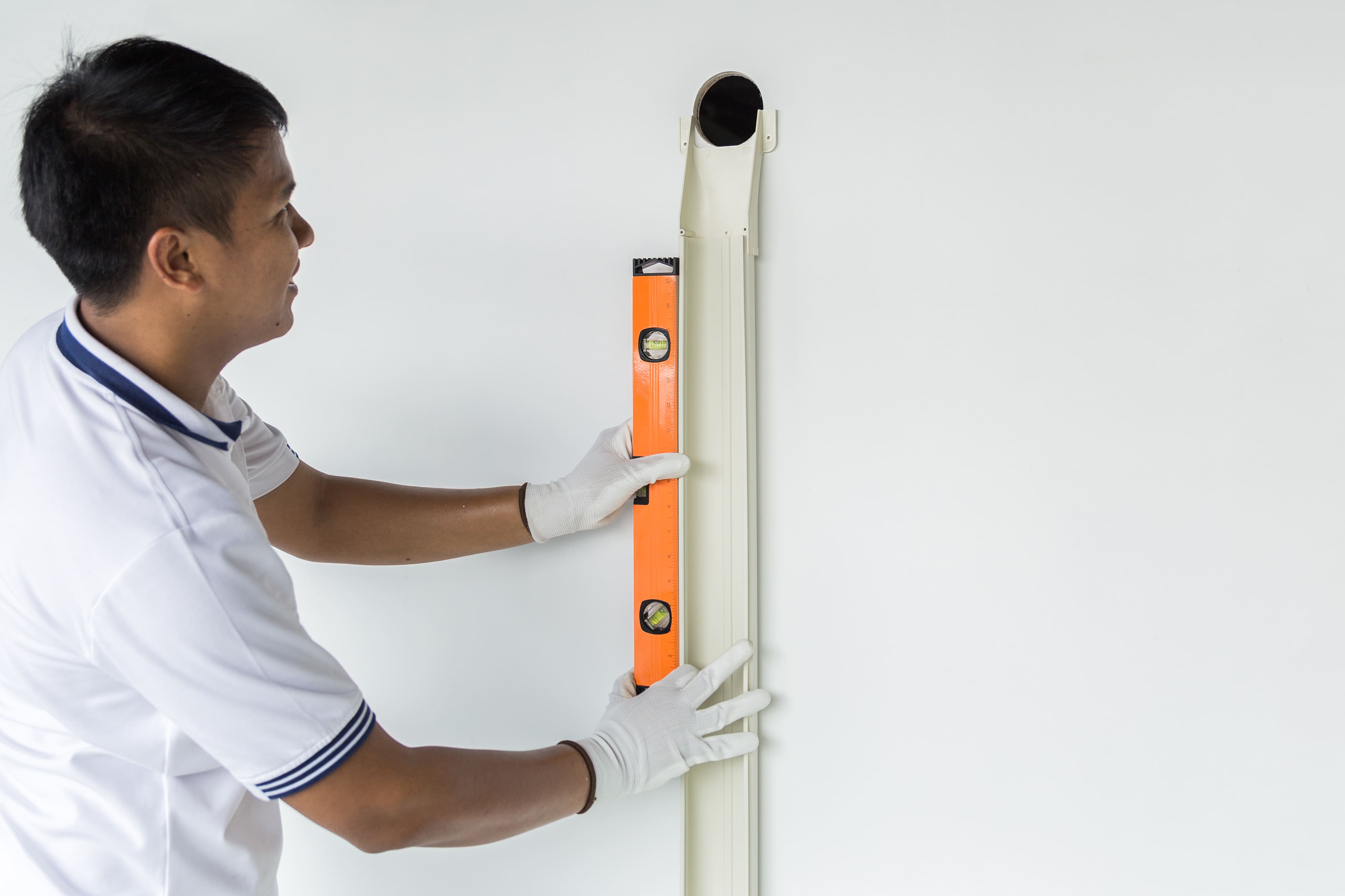ใช้ระดับน้ำวัดแนวรางครอบท่อแอร์ เพื่อกำหนดตำแหน่งฝังพุก