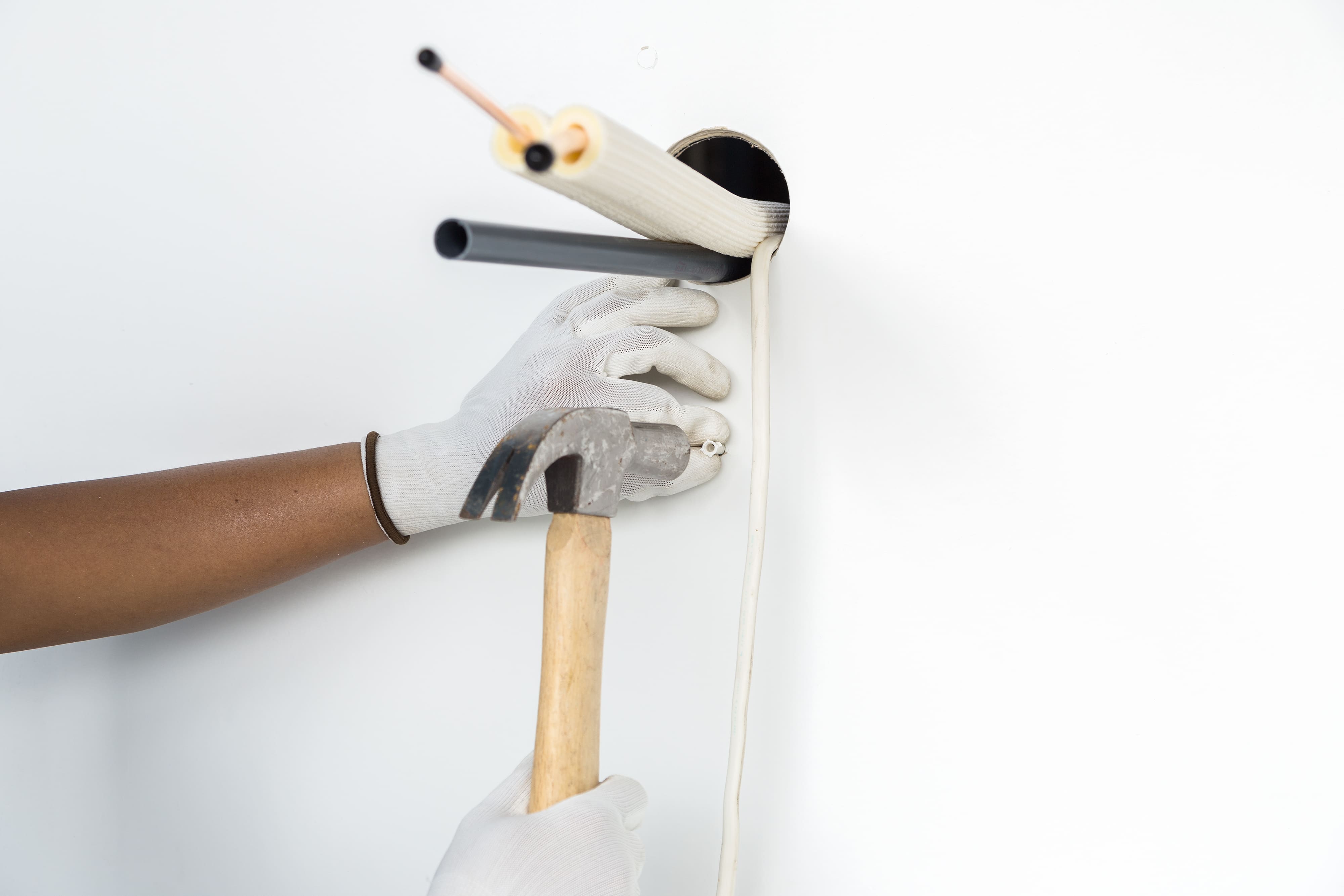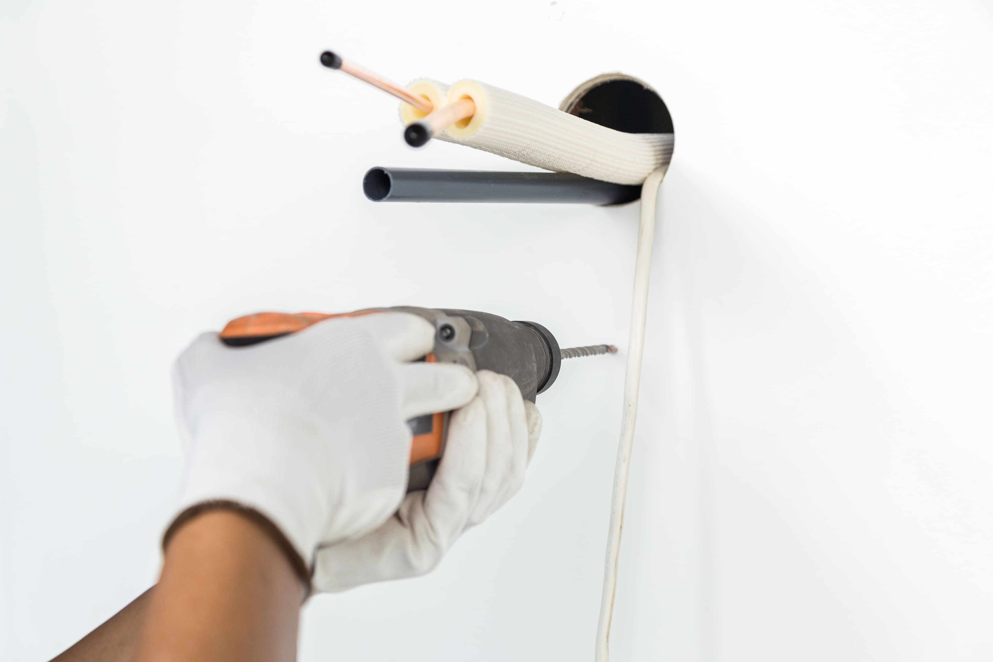 ติดตั้งท่อน้ำยาและสายไฟภายในรางครอบท่อแอร์ชิ้นล่างที่ยึดไว้ก่อนหน้า