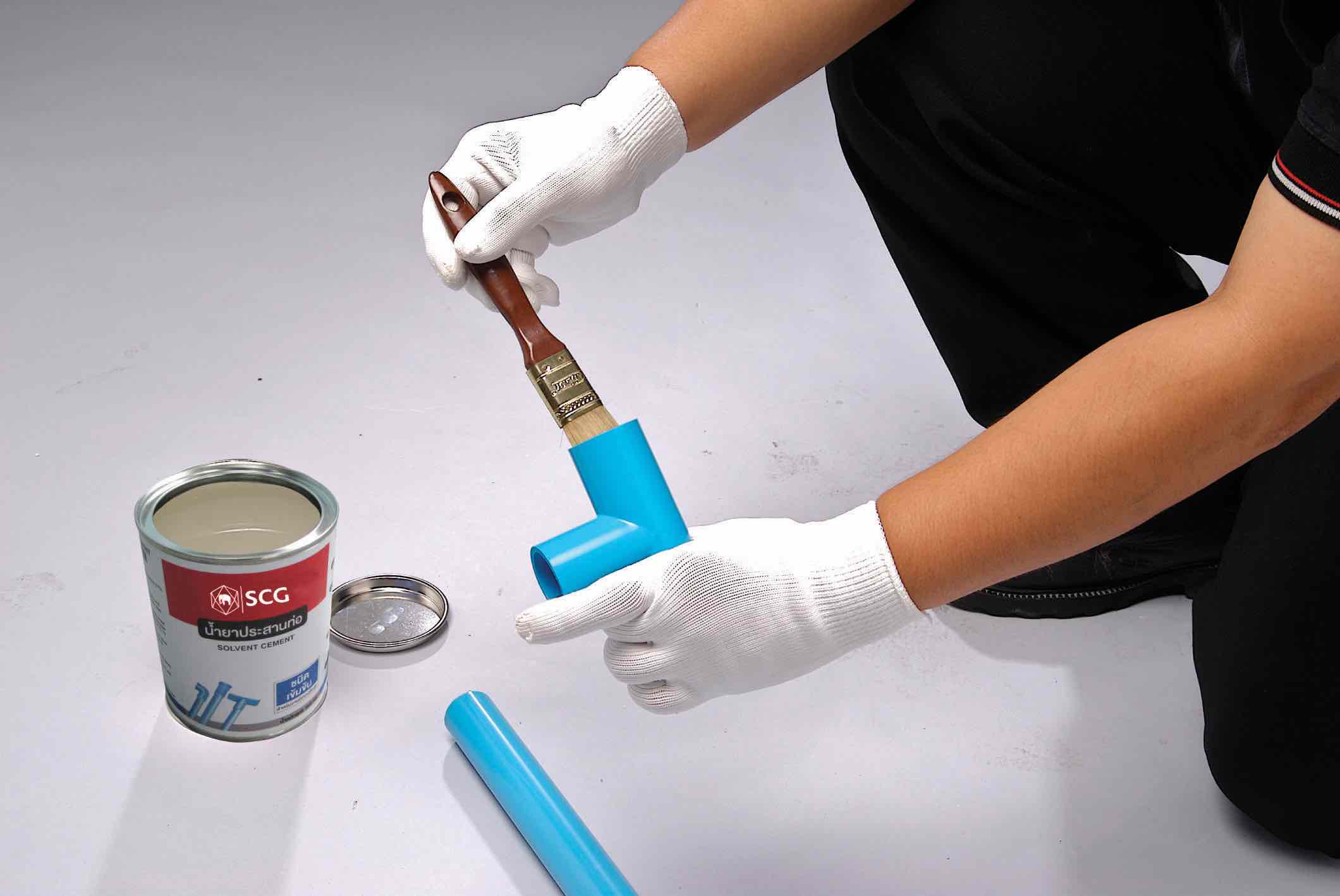 ทาน้ำยาประสานท่อพีวีซีเอสซีจีที่ผิวด้านในข้อต่อให้ทั่วก่อนแล้วจึงทาผิวด้านนอกของท่อ (ควรคนน้ำยาประสานท่อพีวีซี ก่อนการใช้งานทุกครั้ง)