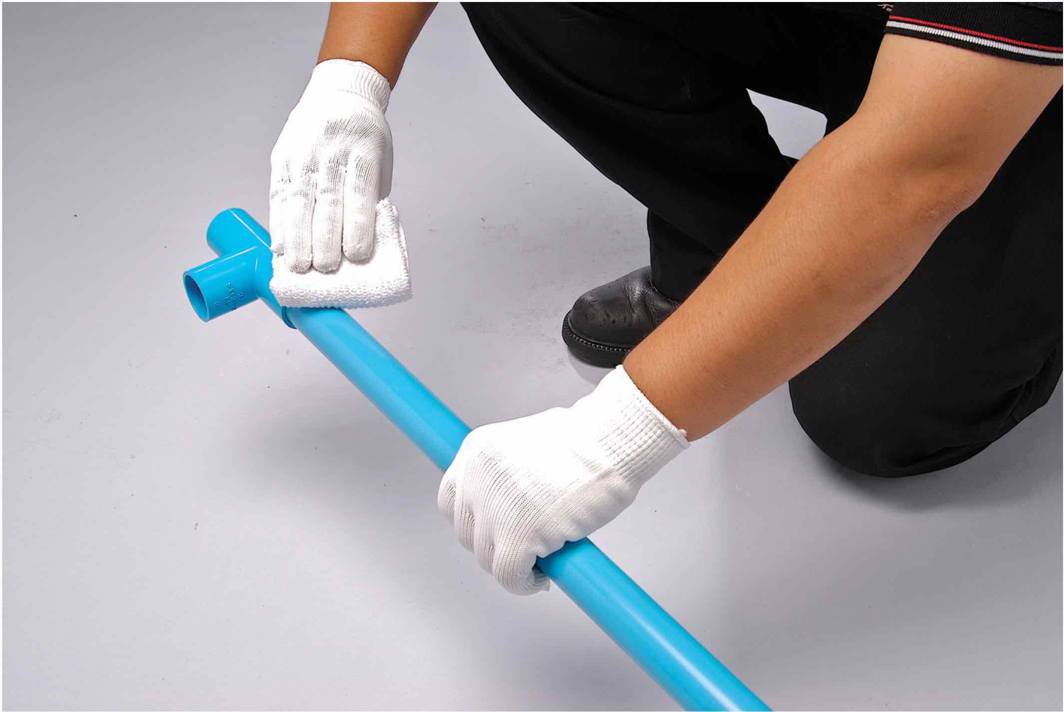 ใช้น้ำยาทำความสะอาดท่อพีวีซี เช็ดทำความสะอาดด้านในข้อต่อและปลายห่อให้ปราศจากคราบน้ำมัน ฝุ่น และความชื้น