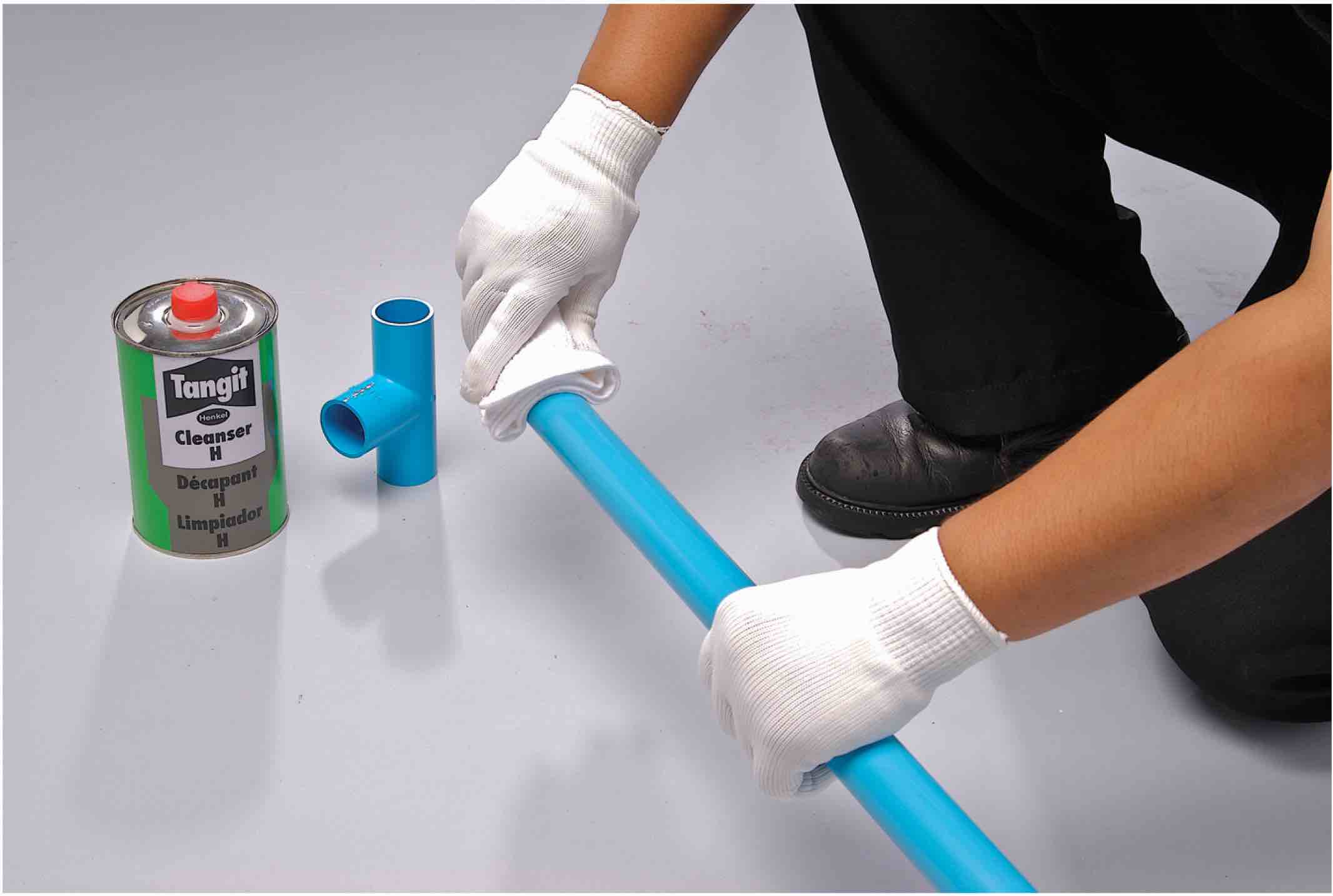ใช้น้ำยาทำความสะอาดท่อพีวีซี เช็ดทำความสะอาดด้านในข้อต่อและปลายห่อให้ปราศจากคราบน้ำมัน ฝุ่น และความชื้น