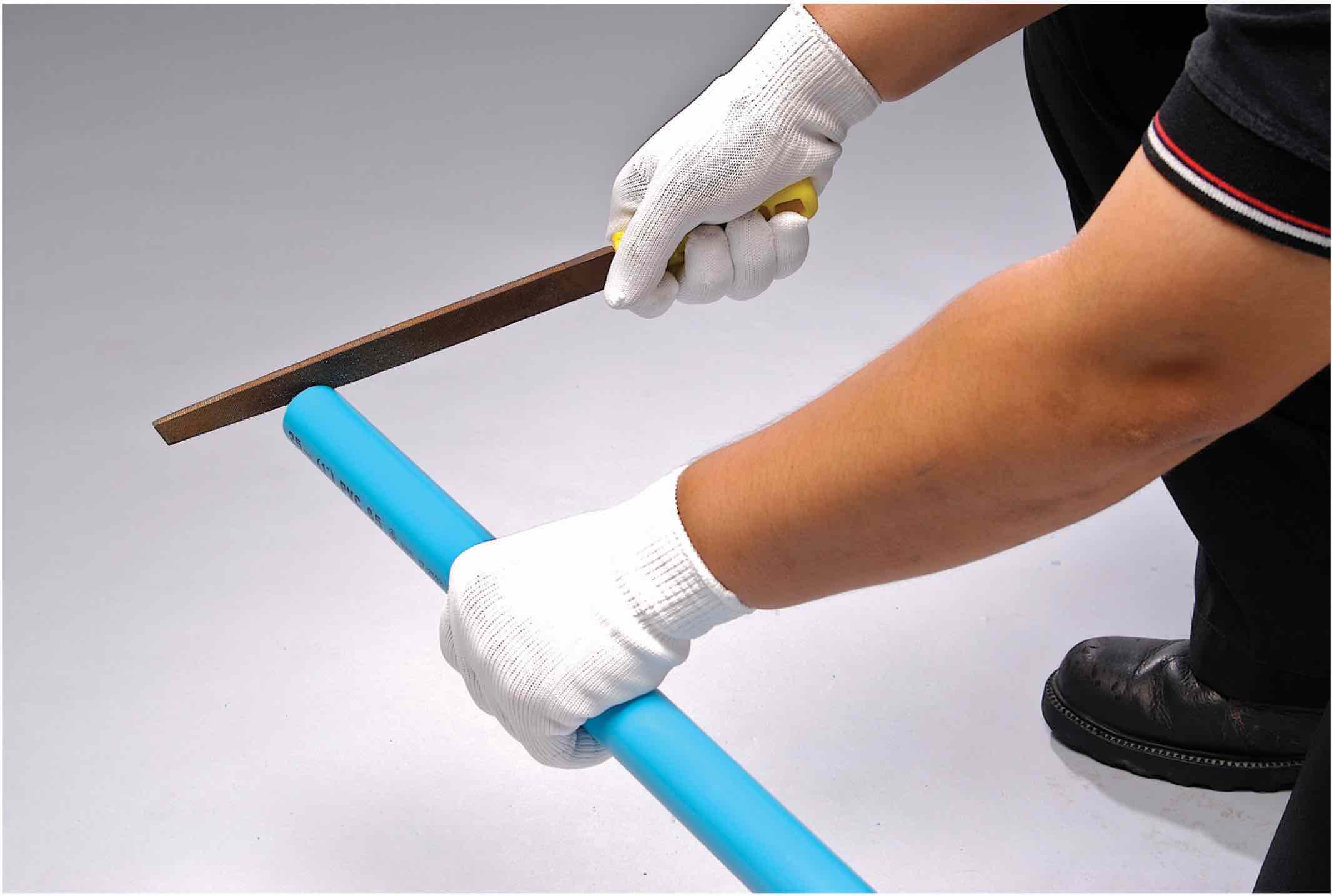ใช้ตะไบละเอียดลบมุมปลายท่อโดยรอบให้มีความลาดเอียงประมาณ 15 องศา